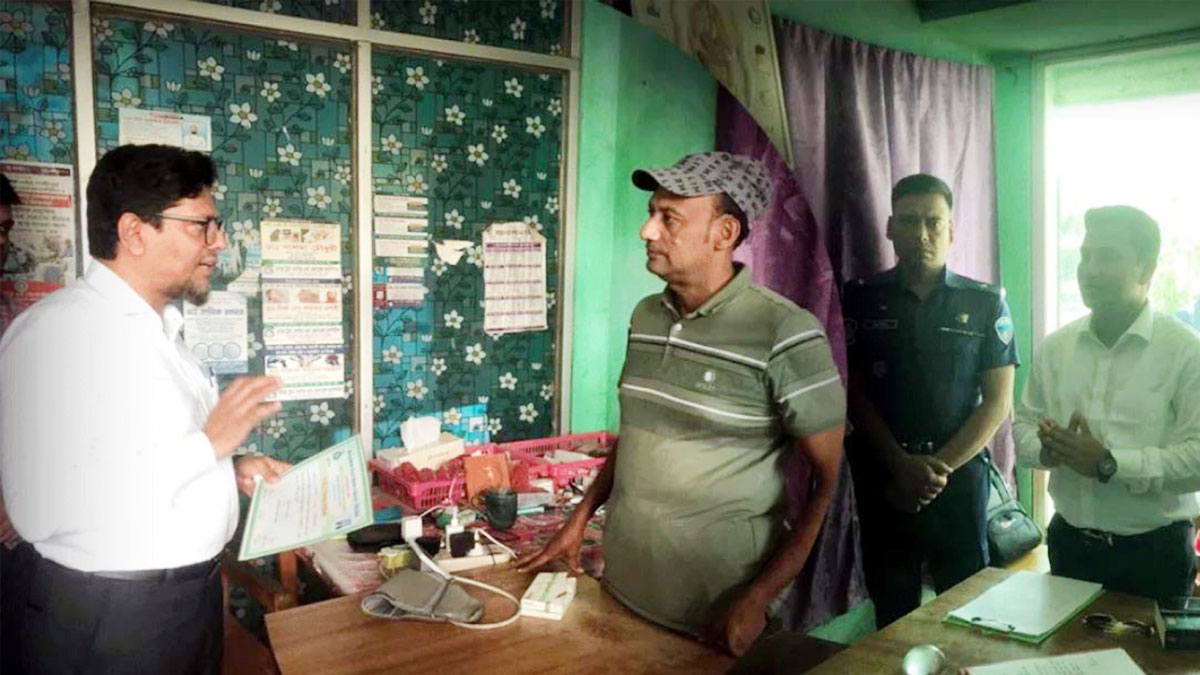 জানা যায়, উপজেলার দক্ষিণ উদমারা গ্রামের হাজি স্টেশন এলাকায় হাজি মেডিকেল হলে অভিযান পরিচালনা করে ভ্রাম্যমাণ আদালত। এ সময় আবু তাহের চিকিৎসক হিসেবে কোনো সনদ দেখাতে পারেননি। তিনি কোনো ডিগ্রি না থাকা সত্ত্বেও রোগী দেখতেন। এতে তাকে ১ লাখ টাকা জরিমানা করা হয়েছে। এ সময় তিনি ফার্মেসিতে আর কোনো রোগী দেখবেন না বলে অঙ্গীকার করেন।