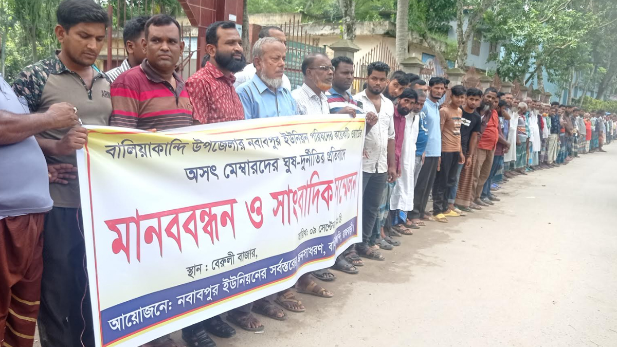 ঘুষ নিয়ে সরকারি ঘর, বিধবা, বয়স্ক, ভিডব্লিউবি, মাতৃত্বকালীন ভাতার কার্ড ও সরকারি ঘর পাইয়ে দেওয়ার অভিযোগ উঠেছে রাজবাড়ীর বালিয়াকান্দির নবাবপুর ইউনিয়নের ৫ ইউপি সদস্যের বিরুদ্ধে। এ ঘটনায় শনিবার (৯ সেপ্টেম্বর) দুপুরে নবাবপুর ইউনিয়ন পরিষদের সামনে মানববন্ধন ও নবাবপুর উচ্চ বিদ্যালয়ে সংবাদ সম্মেলন করেছে স্থানীয় এলাকাবাসী।