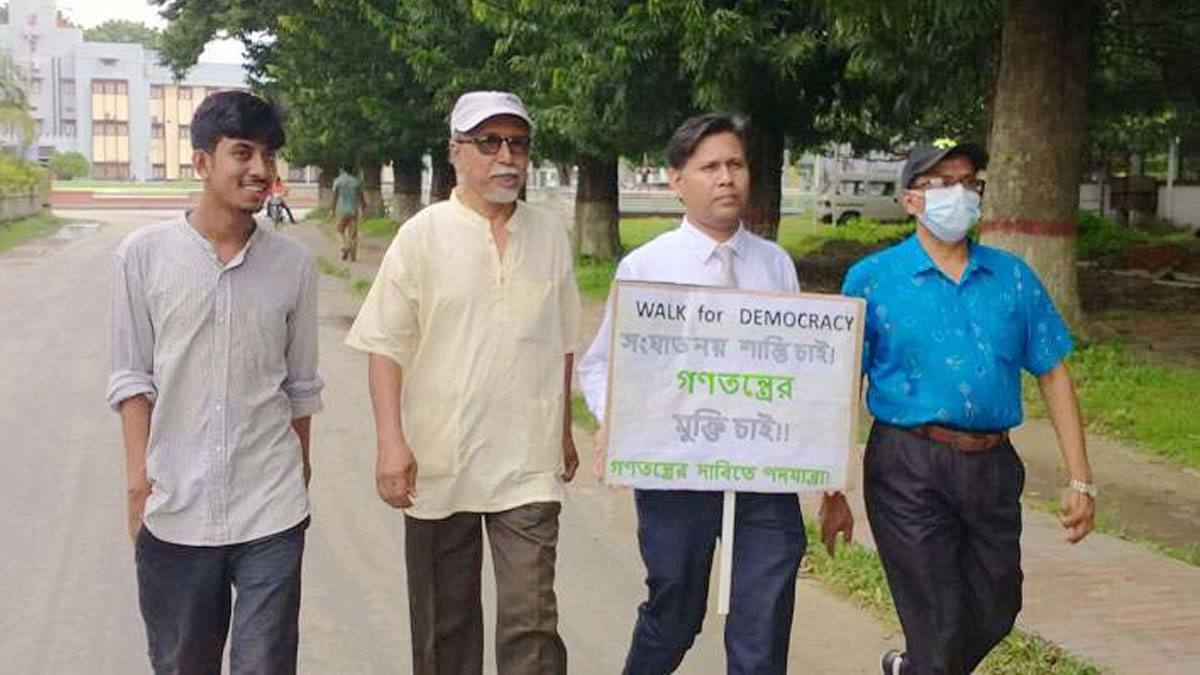 গণতন্ত্রের দাবিতে রাবির তিন শিক্ষকের পদযাত্রা