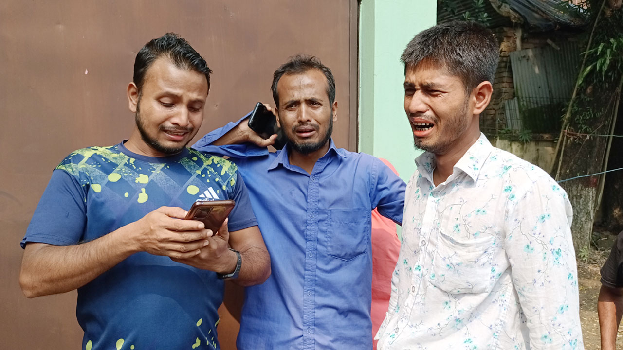 স্ত্রীর মৃত্যুর খবরে কান্নায় ভেঙে পড়েন জেসমিন আক্তারের স্বামী মাহমুদুল হাসান (ডানে সাদা শার্ট পরা)