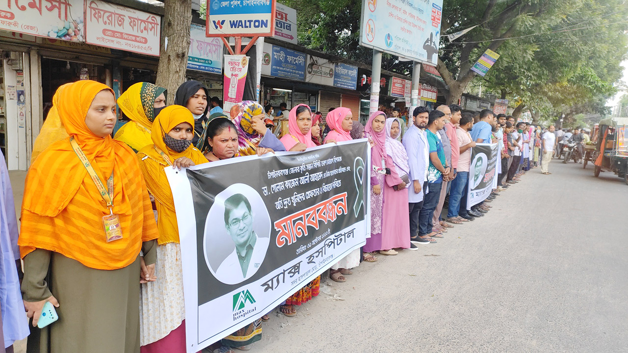 রাজশাহী মেডিকেল কলেজ হাসপাতালের শিশু বিশেষজ্ঞ ও বিএমএ চাঁপাইনবাবগঞ্জ জেলা শাখার সাংগঠনিক সম্পাদক ডা. নাহিদ ইসলাম মুনের সঞ্চালনায় মানববন্ধনে আরও উপস্থিত ছিলেন, ২৫০ শয্যা জেলা হাসপাতালের সাবেক আরএমও ডা. শফিকুল ইসলাম, ডা. নাদিম সরকার, চর্মরোগ বিশেষজ্ঞ ডা. মহিউদ্দিন, অর্থপেডিক সার্জন ডা. ইসমাইল, হৃদরোগ বিশেষজ্ঞ ডা. উমর ফারুকসহ জেলা হাসপাতালের চিকিৎসক, বেসরকারি হাসপাতাল-ক্লিনিক মালিক ও কর্মকর্তা-কর্মচারীরা।