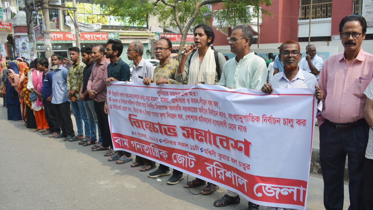 বিরোধী দলের সভা সমাবেশকে কেন্দ্র করে হামলা-মামলা, দমন নিপীড়নের প্রতিবাদ, নিরপেক্ষ তত্ত্বাবধায়ক সরকার গঠনসহ শ্রমিকদের ন্যায্য মজুরি আদায়ের দাবিতে বরিশালে বিক্ষোভ সমাবেশ করেছে বাম গণতান্ত্রিক জোট।