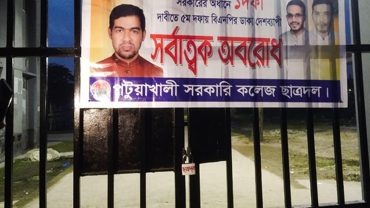 বিএনপির ডাকা পঞ্চম দফা অবরোধের প্রথম দিনে পটুয়াখালী সরকারি কলেজের প্রথম ও দ্বিতীয় গেটে তালা ঝুলিয়ে দিয়েছেন কলেজ শাখার ছাত্রদলের নেতাকর্মীরা।