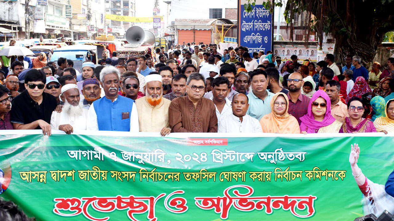 এদিকে দুপুরে তফসিল ঘোষণাকে স্বাগত জানিয়ে মহানগরীতে আনন্দ মিছিল করেছে মেট্রোপলিটন কোতোয়ালি থানা আওয়ামী লীগ। নগরীর শাপলা চত্বর এলাকা থেকে আনন্দ মিছিল বের হয়ে গুরুত্বপূর্ণ সড়ক প্রদক্ষিণ করে। পরে মুক্তিযুদ্ধের চেতনা সমুন্নত রেখে টেকসই গণতন্ত্র ও উন্নয়নের অগ্রযাত্রা অব্যাহত রাখতে পুনরায় আওয়ামী লীগকে ভোট দিয়ে নির্বাচিত করার আহ্বান জানিয়ে সমাবেশে বক্তব্য দেন নেতারা।
