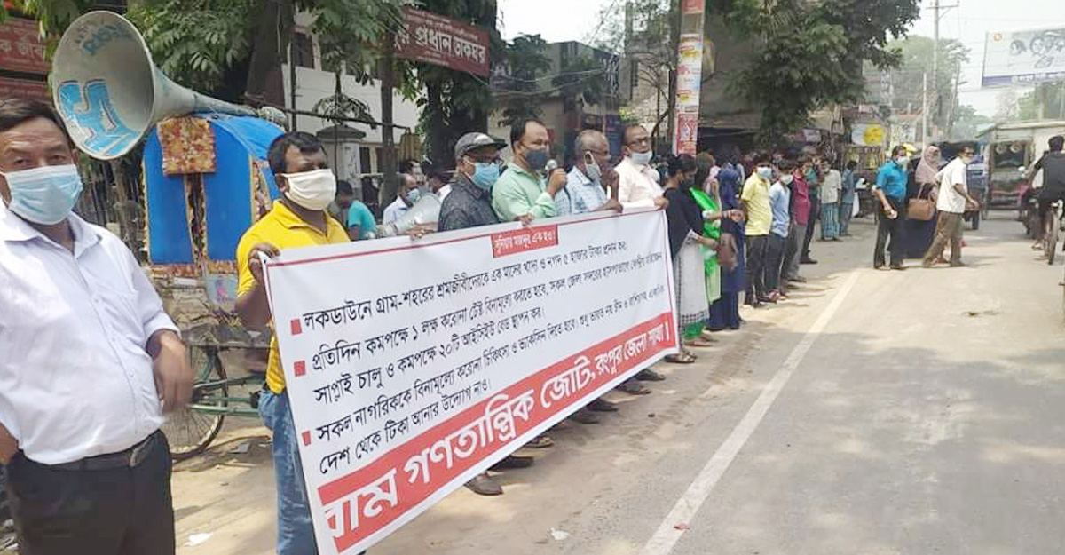 লকডাউনের আগে সাধারণ মানুষের খাদ্য ও চিকিৎসা নিরাপত্তা নিশ্চিত করার দাবিতে এ মানববন্ধনের আয়োজন করে রংপুর জেলা বাম গণতান্ত্রিক জোট।