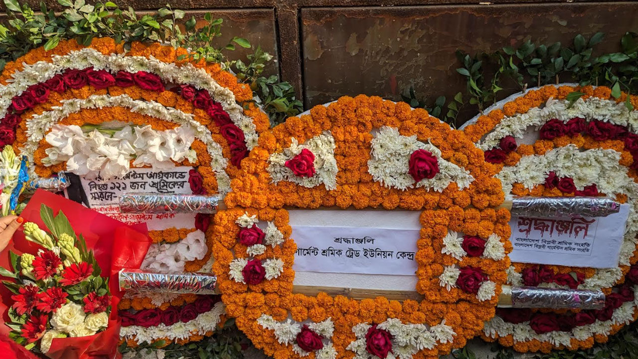 শুক্রবার (২৪ নভেম্বর) তাজরীন ফ্যাশনের সামনে আগুনে পুড়ে অঙ্গার হওয়া শ্রমিকদের স্মরণে ফুল দিয়ে শ্রদ্ধা জানান নিহতের স্বজন, আহত ও সাধারণ শ্রমিকসহ শ্রমিক নেতারা।