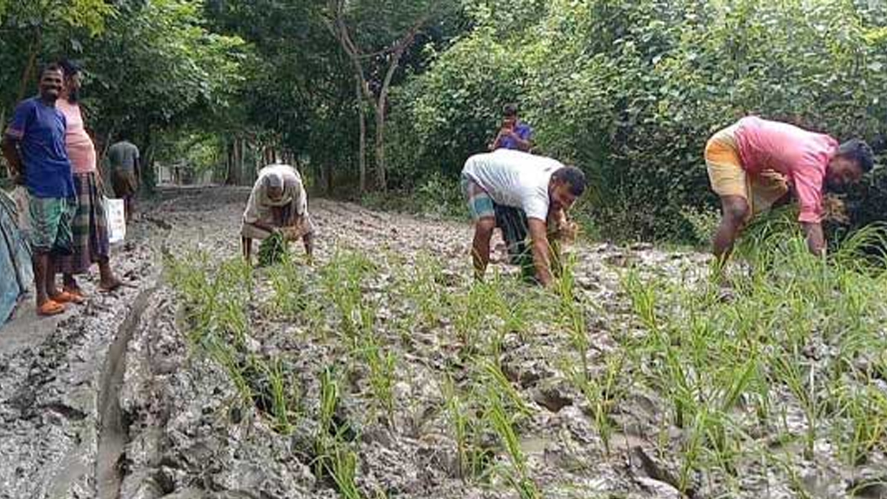 পাকা না করায় রাস্তায় ধানের চারা রোপণ করলেন গ্রামবাসী