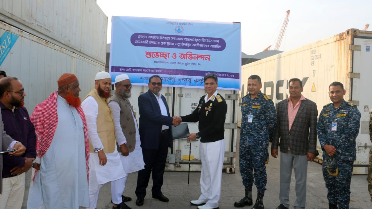 হিমায়িত ফল আমদানিকারকদের ডেলিভারি প্রদানের সময় মোংলা বন্দর কর্তৃপক্ষের চেয়ারম্যান রিয়ার অ্যাডমিরাল মীর এরশাদ আলী, সদস্য (হারবার ও মেরিন) ক্যাপ্টেন মো. আসাদুজ্জামান, সদস্য (প্রকৌশল ও উন্নয়ন) ড. এ. কে. এম. আনিসুজ্জামান, পরিচালক (ট্রাফিক) কমান্ডার আব্দুল্লাহ আল মেহেদী, বিএফএফআইএ’র সভাপতি মো. সিরাজুল ইসলাম, কাস্টমস কর্মকর্তাগণ, আমদানিকারকগণ উপস্থিত ছিলেন।