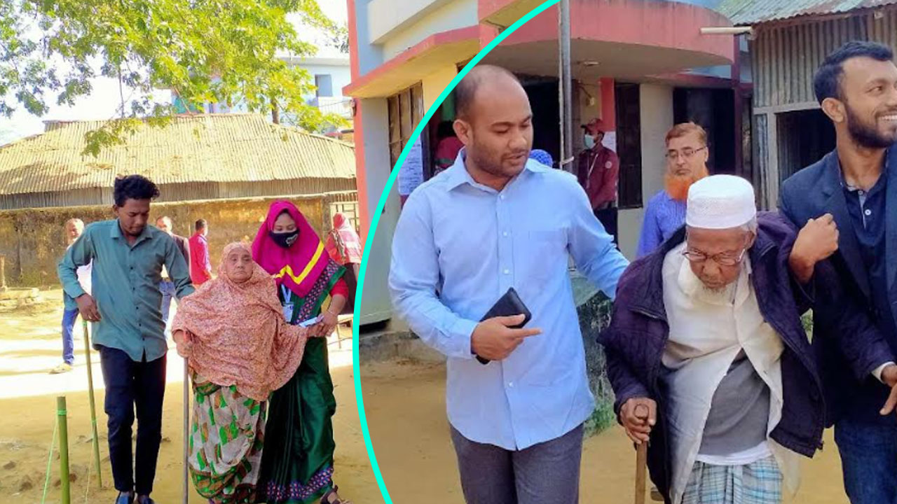 লাঠিতে ভর করেও একা হাঁটতে পারেন না দুই বৃদ্ধ। সঙ্গে থাকা দুই প্রতিবেশী তাদের নিয়ে এসেছেন ভোটকেন্দ্রে। শারীরিক অসুস্থতাকে উপেক্ষা করে ৯২ বছর বয়সী বৃদ্ধ হাসু মিয়া ও আলেক জান দিয়েছেন নিজের ভোট।