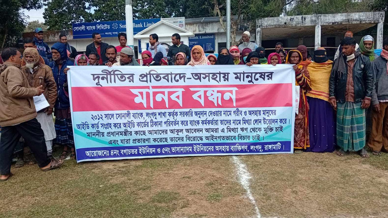 মানববন্ধনে ভুক্তভোগীরা বলেন, ২০১২ ও ২০১৩ সালে স্থানীয় হেলাল, সেলিম, মিষ্টি কালামসহ কয়েকজন দালাল সরকারি অনুদান দেওয়ার কথা বলে আমাদের কাছ থেকে এনআইডি কার্ডের ফটোকপি ও ছবি নেন। এখন এত বছর পরে আমরা ঋণের বিষয়টি জানতে পারি। সম্প্রতি আমাদের নামে নোটিশ দিয়েছে ব্যাংক কর্তৃপক্ষ।