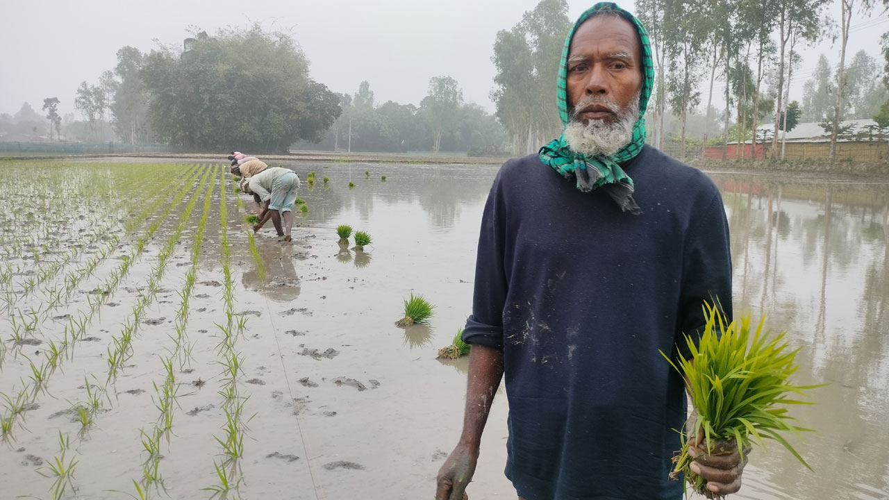 সংসার চালাতে তীব্র শীত উপেক্ষা করেও অন্যের জমিতে ধান লাগানোর কাজ করছেন আব্দুস সালাম। একই জমিতে দিনমজুরি দিচ্ছেন শাহজামাল, কালাম, কাশেম আলী, নাজমুলসহ আরও কয়েকজন শ্রমজীবী মানুষ। প্রত্যেকেরই দিনমজুরি না দিলে সংসার চলে না।