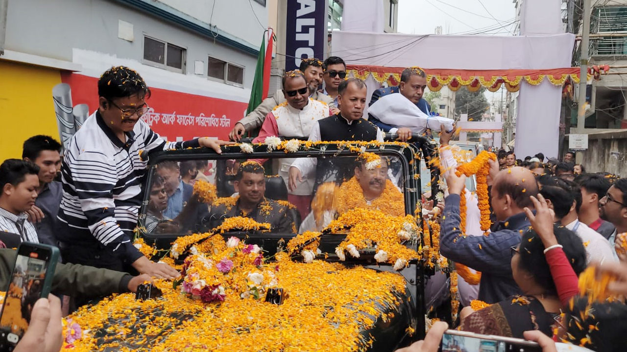 বান্দরবান আসনে টানা সপ্তমবারের মতো নির্বাচিত সংসদ সদস্য বীর বাহাদুর উশৈসিংকে নাগরিক সংবর্ধনা দেওয়া হয়েছে। বৃহস্পতিবার (১৮ জানুয়ারি) বিকেলে জেলার ঐতিহাসিক রাজার মাঠে তাকে এ সংবর্ধনা দেওয়া হয়। রাস্তার দুই পাশে দাঁড়িয়ে হাজারো কর্মী-সমর্থক ফুল ছিটিয়ে, গলায় মালা পরিয়ে তাকে বরণ করে নেন।