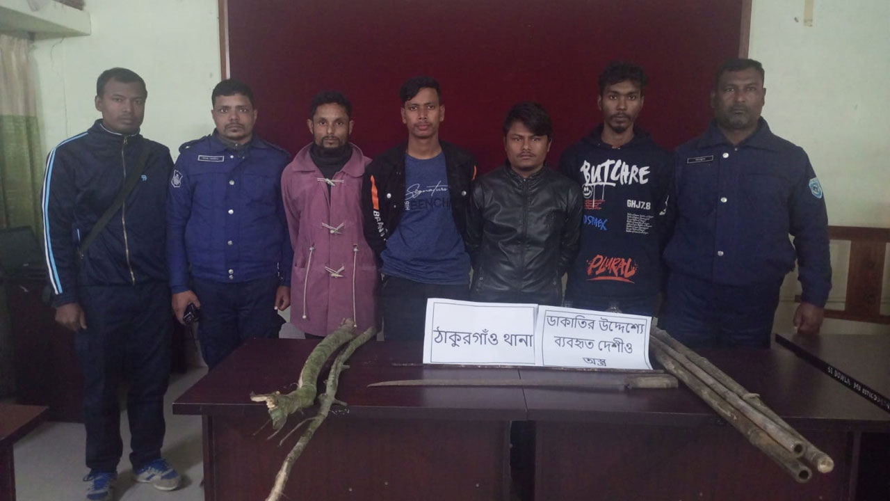 পুলিশ জানায়, ঠাকুরগাঁও-পীরগঞ্জ সড়কের পুরাতন বিমানবন্দর এলাকায় শনিবার রাত ২টার দিকে একদল ডাকাত রাস্তায় কলাগাছ ফেলে ব্যারিকেড দেয়। এ খবর শুনে ঘটনাস্থলে গিয়ে চারজনকে গ্রেপ্তার করে পুলিশ। গ্রেপ্তার ব্যক্তিদের কাছ থেকে বাঁশের লাঠি, লোহার রড, ধারালো ছোরা উদ্ধার করা হয়।
