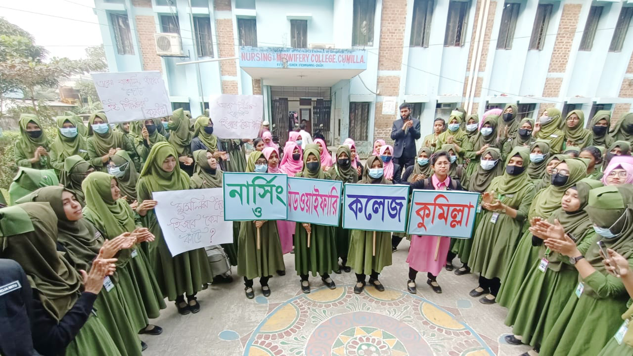 কুমিল্লা নার্সিং ও মিডওয়াইফারী কলেজে দুই শিক্ষার্থীর হিজাব কেটে দেওয়ার অভিযোগে শিক্ষকদের বিরুদ্ধের আন্দোলনে নেমেছে ওই কলেজের শিক্ষার্থীরা।