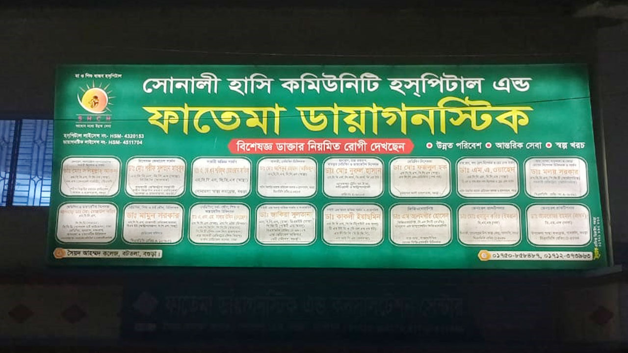 জেলা সিভিল সার্জন কার্যালয়ে খোঁজ নিয়ে জানা গেছে, সোনাতলা সৈয়দ আহমেদ কলেজ এলাকার সোনালী হাসি কমিউনিটি হসপিটাল অ্যান্ড ফাতেমা ডায়াগনস্টিক নিবন্ধিত প্রতিষ্ঠান। এর মধ্যে সোনালী হাসি কমিউনিটি হাসপাতালের নিবন্ধন আছে আবদুল আলীমের নামে। আর ফাতেমা ডায়াগনস্টিকের নিবন্ধন রয়েছে ফাতেমা জিন্নাহর নামে।
