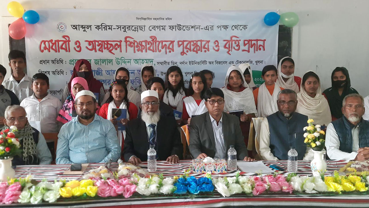 খুলনায় ‘আব্দুল করিম-সবুরন্নেছা বেগম ফাউন্ডেশন’ এর পক্ষ থেকে মেধাবী ও অসচ্ছল শিক্ষার্থীদের মাঝে পুরস্কার এবং বৃত্তি প্রদান করা হয়েছে। বৃহস্পতিবার (৮ ফেব্রুয়ারি) দুপুরে জেলার ডুমুরিয়া উপজেলার রুদাঘরা মাধ্যমিক বিদ্যালয় মিলনায়তনে এ অনুষ্ঠানের আয়োজন করা হয়।