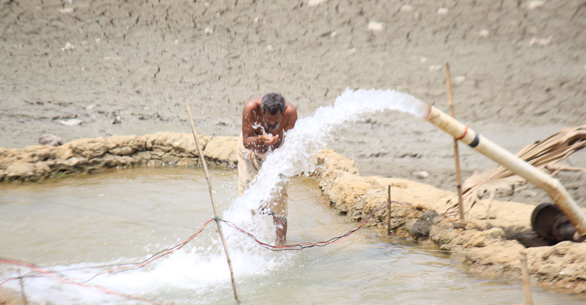 পাম্পের পানিতে পিপাসা মেটাচ্ছেন এক কৃষক