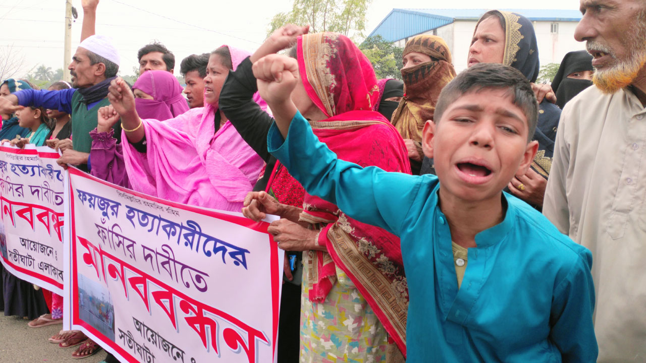 বড় ভাইয়ের হত্যাকারীদের ফাঁসির দাবিতে আয়োজিত মানববন্ধনে এভাবেই কথাগুলো বলছিল নিহত ফয়জুর রহমানের (২৭) ছোট ভাই মো. ফয়সাল ইসলাম (১১)। মঙ্গলবার (১৩ ফেব্রুয়ারি) বিকেলে যশোর-মনিরামপুর মহাসড়কে মানববন্ধন এবং বিক্ষোভ মিছিল করেন এলাকাবাসী। সেখানে বক্তব্য দেয় ফয়সাল ইসলাম।