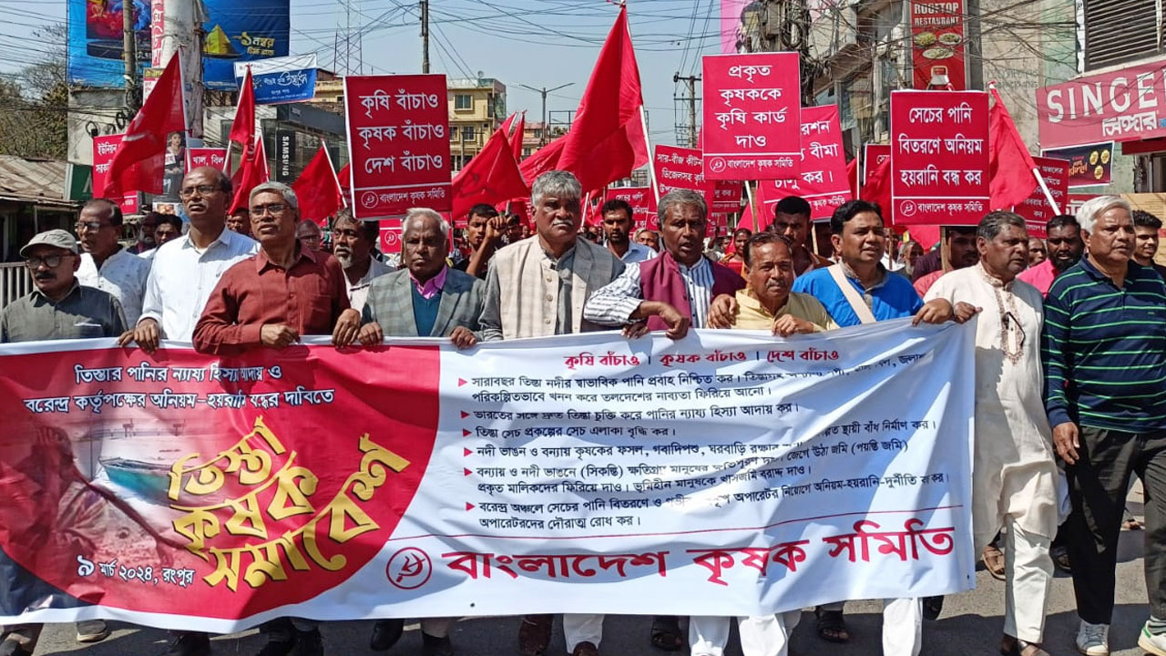 শনিবার (৯ মার্চ) দুপুরে রংপুর নগরীর শাপলা চত্বর বটতলায় অনুষ্ঠিত তিস্তা কৃষক সমাবেশে এসব কথা বলেছেন বাংলাদেশ কৃষক সমিতির নেতৃবৃন্দ। তিস্তা নদীর ন্যায্য হিস্যা আদায় ও বরেন্দ্র অঞ্চলে সেচের পানি বিতরণে বরেন্দ্র কর্তৃপক্ষের অনিয়ম, হয়রানি ও দুর্নীতি বন্ধের দাবিতে এ সমাবেশ অনুষ্ঠিত হয়।