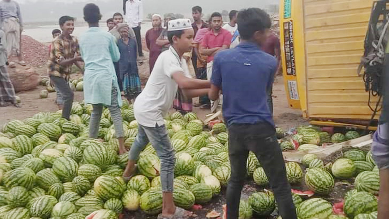 নিয়ন্ত্রণ হারিয়ে তরমুজভর্তি ট্রাক খাদে