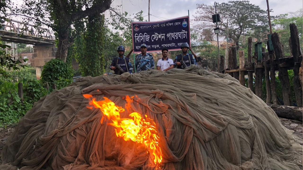 পাথরঘাটায় ৫ কোটি টাকার অবৈধ জাল পুড়িয়ে ধ্বংস