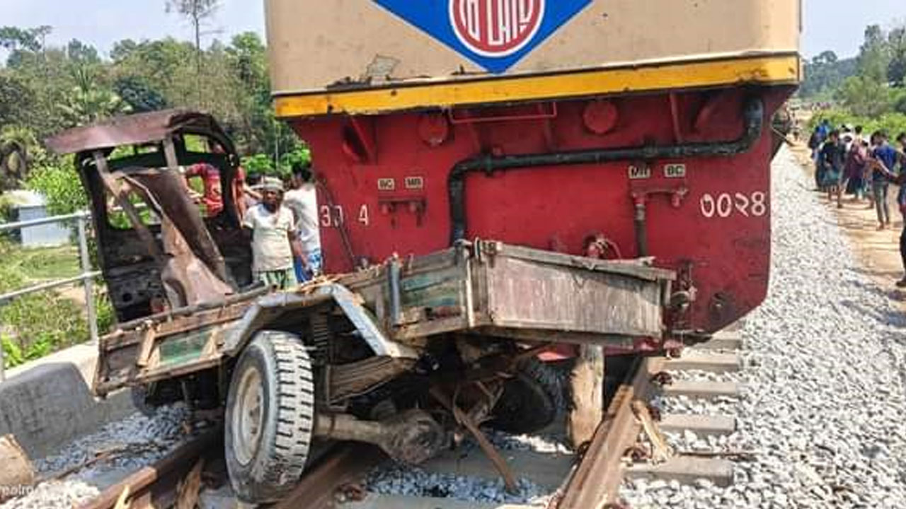 রেললাইনে আটকে গেল নছিমন, ধাক্কা দিয়ে থামল ট্রেন