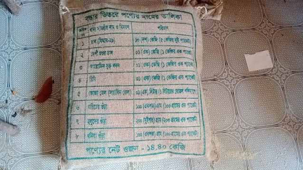 তবে এসময় কাউকে আটক করা যায়নি। উদ্ধার করা এই চাল উপজেলা পরিষদ কার্যালয়ে রাখা হয়েছে। উদ্ধার প্রতিটি বস্তায় ১০ কেজি চাল, ডাল, তেলসহ মোট ১৪ কেজি ৪শ গ্রাম খাদ্যসামগ্রী ছিল।