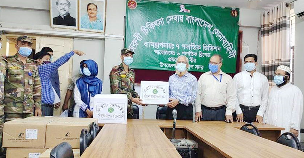 সিভিল সার্জনের কাছে ১ হাজার পিস আইভি স্যালাইন হস্তান্তর করে সেনাবাহিনী