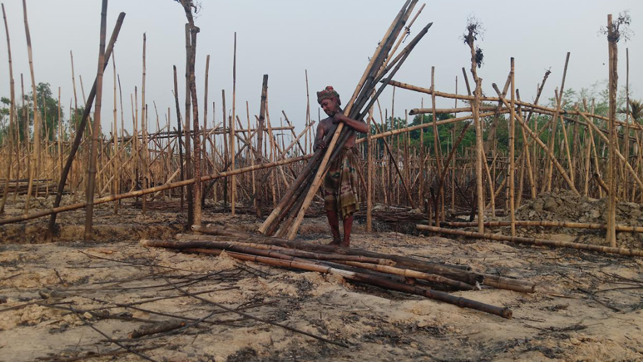 বিকেলে নিজের জমিতে শ্রমিক দিয়ে পোড়া বাঁশগুলো জমিতে জড় করছিলেন অপর পানচাষি মুনতাজ হোসেন। তার দাবি, এই বাঁশ ও বাঁশের বাতাগুলো কোনো কাজে লাগবে না। তাই বের করে তিনি জমি পরিষ্কার করছেন।