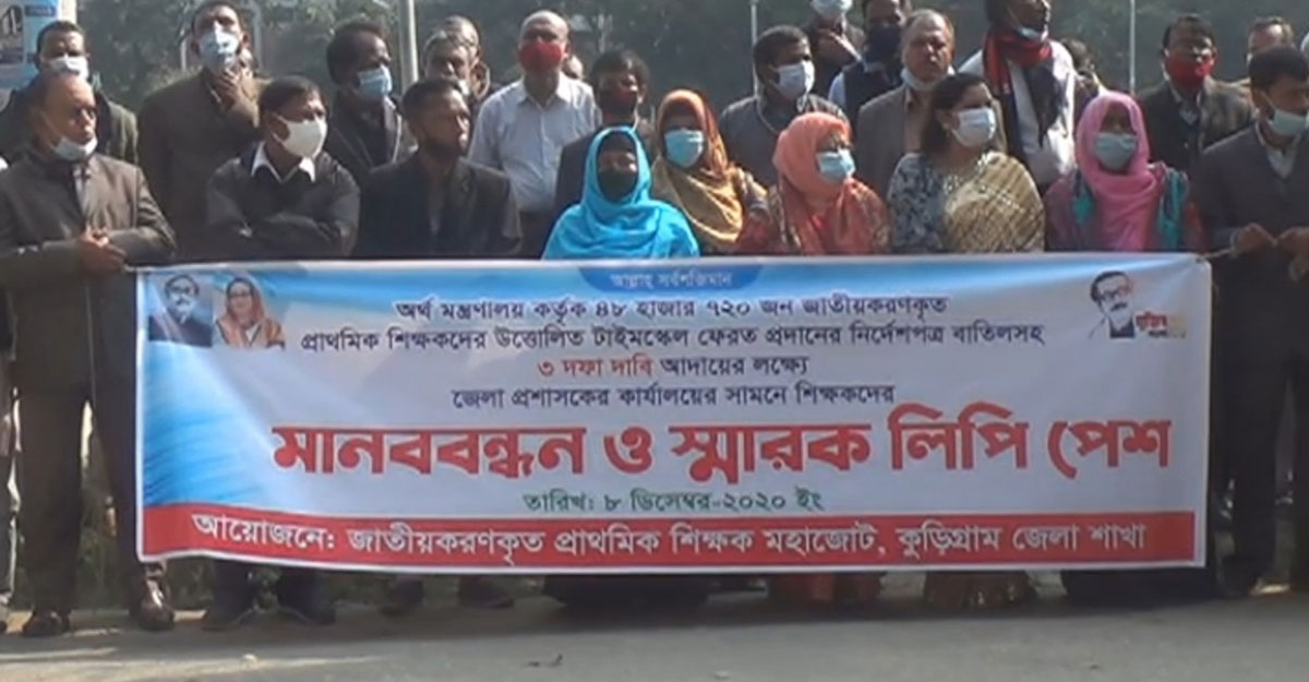 মানববন্ধনে বক্তব্য দেন প্রাথমিক শিক্ষক মহাজোট কুড়িগ্রাম জেলা কমিটির আহ্বায়ক মোছা. শাহনাজ পারভীন, যুগ্ম আহ্বায়ক কামরুজ্জামান বকসী, ভুরুঙ্গামারী উপজেলা সাধারণ সম্পাদক মো. আলফাজ আলম প্রমুখ। পরে শিক্ষকরা জেলা প্রশাসকের মাধ্যমে প্রধানমন্ত্রী বরাবর স্মারকলিপি প্রদান করেন।