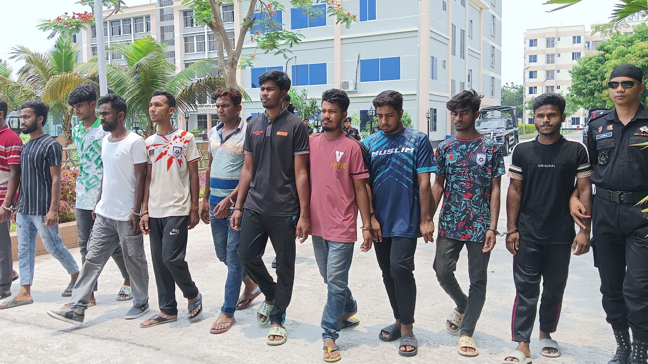 গ্রেপ্তাররা হলেন নগরের খোজাপুর এলাকার আজিমুদ্দিনের ছেলে মিজানুর রহমান (৩০), একই এলাকার মৃত মুকুলের ছেলে মো. বকুল (৩৮), ডাসমারী পূর্বপাড়ার বাবুল হোসেনের ছেলে মো. ঈমান (২৪), আমজাদ হোসেনের ছেলে মো. শাকিব (২৫), আব্দুর রাজ্জাকের ছেলে মো. রবিন (২০), আসলাম আলীর ছেলে মো. রাব্বি (২৪), শমসের আলীর ছেলে আমান (২২), নাসির উদ্দিনের ছেলে বিজয় (১৭), আব্দুল খালেকের ছেলে মো. অনিক (২১)। তারা মতিয়া থানাধীন ধরমপুর পূর্বপাড়ার বাসিন্দা। এ ছাড়া চর শ্যামপুরের মোতালেবের ছেলে ইয়ামিন আলী (২৮) ও চারঘাটের শিমুলিয়া এলাকার শাহজাহানের ছেলে বিপ্লব আলী (২২)।