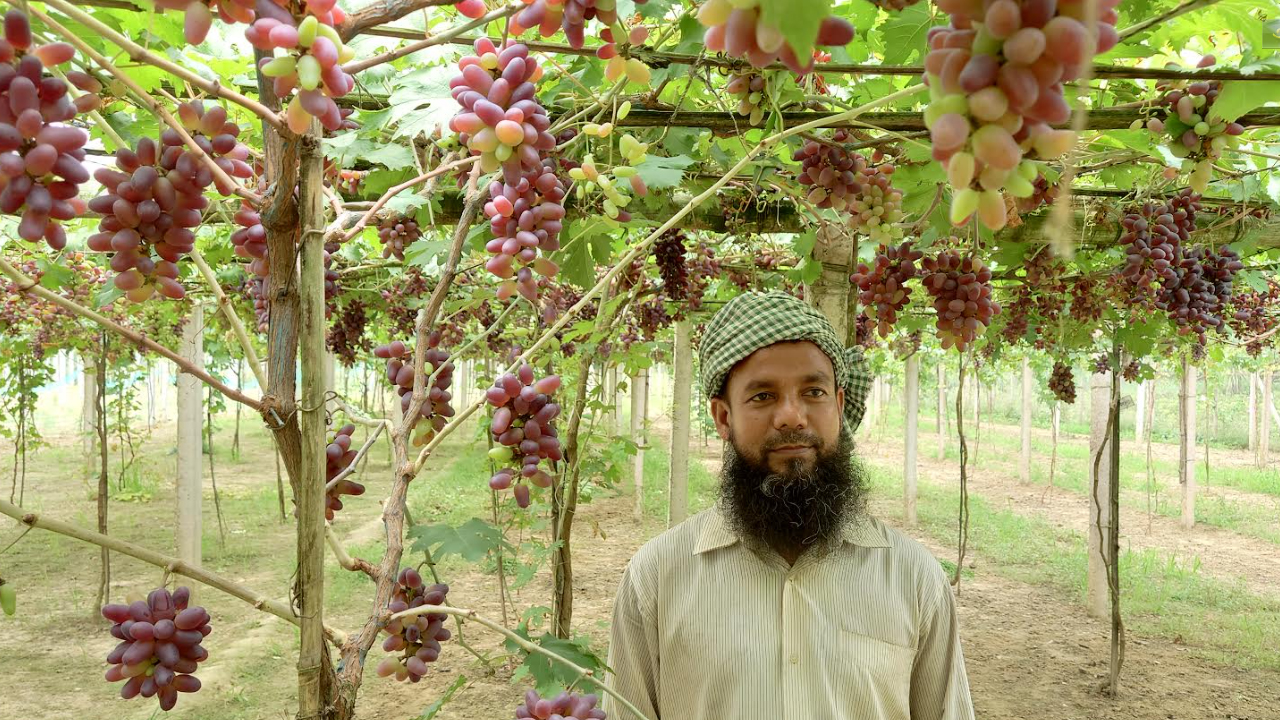 সবুজ পাতার ফাঁকে ফাঁকে থোকায় থোকায় ঝুলে আছে মিষ্টি রসালো কাল ও লাল আঙুর। সুতা ও বাঁশের মাচায় ঝুলে থাকা মিষ্টি এই রসালো ফলের পরিচর্যায় ব্যস্ত চাষি। ‘বিদেশি ফল আঙুর, দেশে চাষ করলে টক হয়’- এমন ধারণাকে বদলে দিতে, কয়েক বছর ধরে বিভিন্ন দেশ থেকে ৮টি জাতের আঙুরের চারা সংগ্রহ করে আবাদ শুরু করেন তিনি। অবশেষে ৫ জাতের আঙুরের বাণিজ্যিক চাষে সফলতা পেয়েছেন।