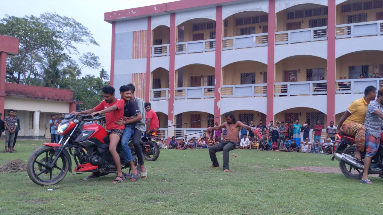 কখনো মাথা মাটির নিচে ঢুকিয়ে, কখনো চুল দিয়ে মোটরসাইকেল আটকে কিংবা মুখে আগুন নিয়ে নানা ভঙ্গিতে শারীরিক কসরত করে দেখাচ্ছেন এক ব্যক্তি। এসব অদ্ভুত কর্মকাণ্ড দেখতে তাকে ঘিরে দাঁড়িয়ে আছে হাজারো মানুষ। শনিবার (১৮ মে) বিকেলে এমন দৃশ্য দেখা যায় বাগেরহাটের রামপাল উপজেলার চাকশ্রী এবিসি মাধ্যমিক বিদ্যালয় মাঠে।