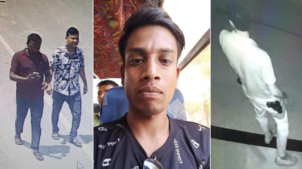 বাঁ থেকে দ্বিতীয় ছবিতে নিখোঁজ মো. সাগর আলী, বাম ও ডান পাশের ছবিগুলো সিসিটিভি ফুটেজ থেকে নেওয়া, যারা শনিবার সেই হোটেলে রাতযাপন করেন।
