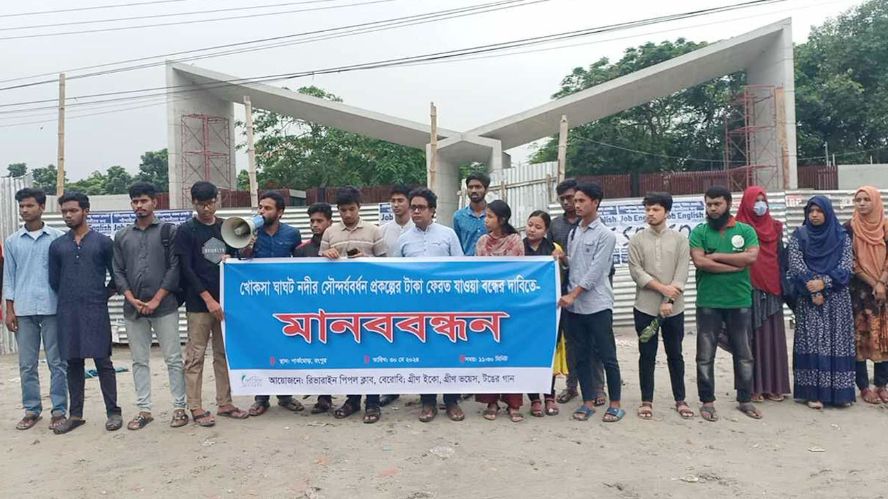 বৃহস্পতিবার (৩০ মে) দুপুর ১২টায় খোকসা ঘাঘট নদীর বিপরীতে বেগম রোকেয়া বিশ্ববিদ্যালয়ের প্রধান ফটকের সামনে মানববন্ধন করেছে নদী বিষয়ক সংগঠন রিভারাইন পিপল, পরিবেশবাদী সংগঠন গ্রীন ভয়েস, সামাজিক-সাংস্কৃতিক সংগঠন টঙ্গের গান।