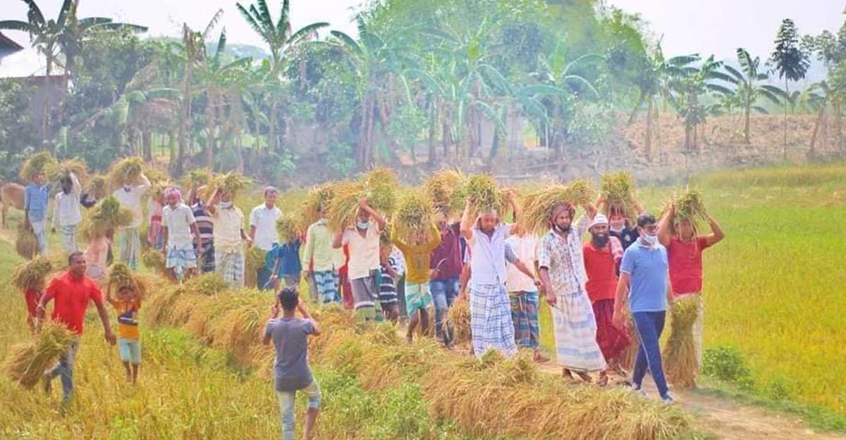 পাকা ধান কেটে মাথায় নিয়ে কৃষকের বাড়িতে পৌঁছে দিচ্ছেন আওয়ামী, যুব ও ছাত্রলীগের নেতাকর্মীরা