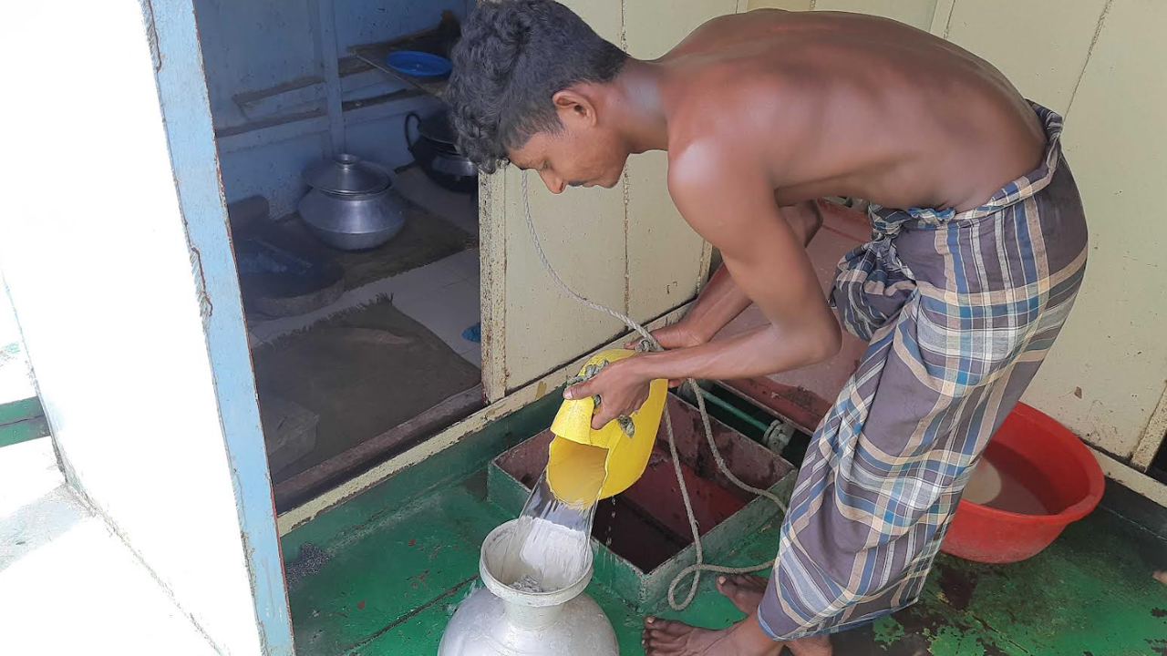 এসময় কথা হয় জাহাজের ক্যাপ্টেন শাহজাহানের সাথে। তিনি জানান, মূলত মেঘনা নদী থেকে রিজার্ভারে পানি ভরে নিয়ে আসেন তারা। তাদের রিজার্ভারে ৫ থেকে ৬ হাজার লিটার পানি ধরে। একবারের ট্রিপে সব পানি ব্যবহার হয় না। তাই ঘষিয়াখালী এলাকায় যখন জাহাজ নোঙ্গর করা থাকে তখন স্থানীয়রা কলস নিয়ে আসলে তাদের পানি দেন তারা।