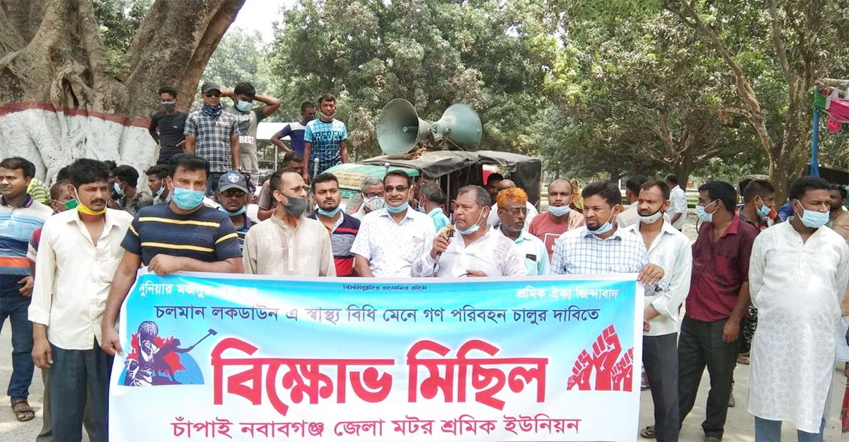 গণপরিবহন চালুর দাবিতে চাঁপাইনবাবগঞ্জে বিক্ষোভ