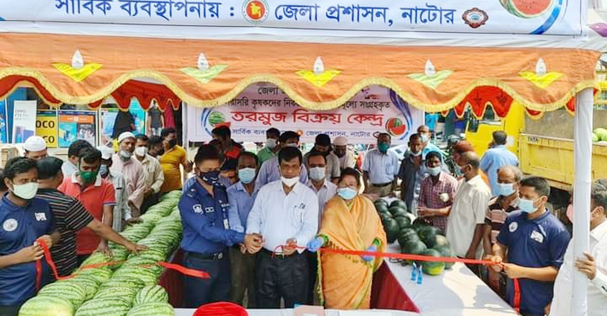 মধ্যস্বত্বভোগীদের সিন্ডিকেট ভেঙে সরাসরি কৃষকদের মাধ্যমে তরমুজ বিক্রি করে ও ভোক্তা পর্যায়ে ন্যায্য মূল্য নিশ্চিত করতে নাটোরে জেলা প্রশাসনের উদ্যোগে তরমুজ বিক্রি শুরু হয়েছে। রোববার (২ মে) সকালে নাটোর শহরের কেন্দ্রীয় মসজিদের সামনে আনুষ্ঠানিকভাবে তরমুজ বিক্রি কার্যক্রমের উদ্বোধন করেন জেলা প্রশাসক মো. শাহরিয়াজ।