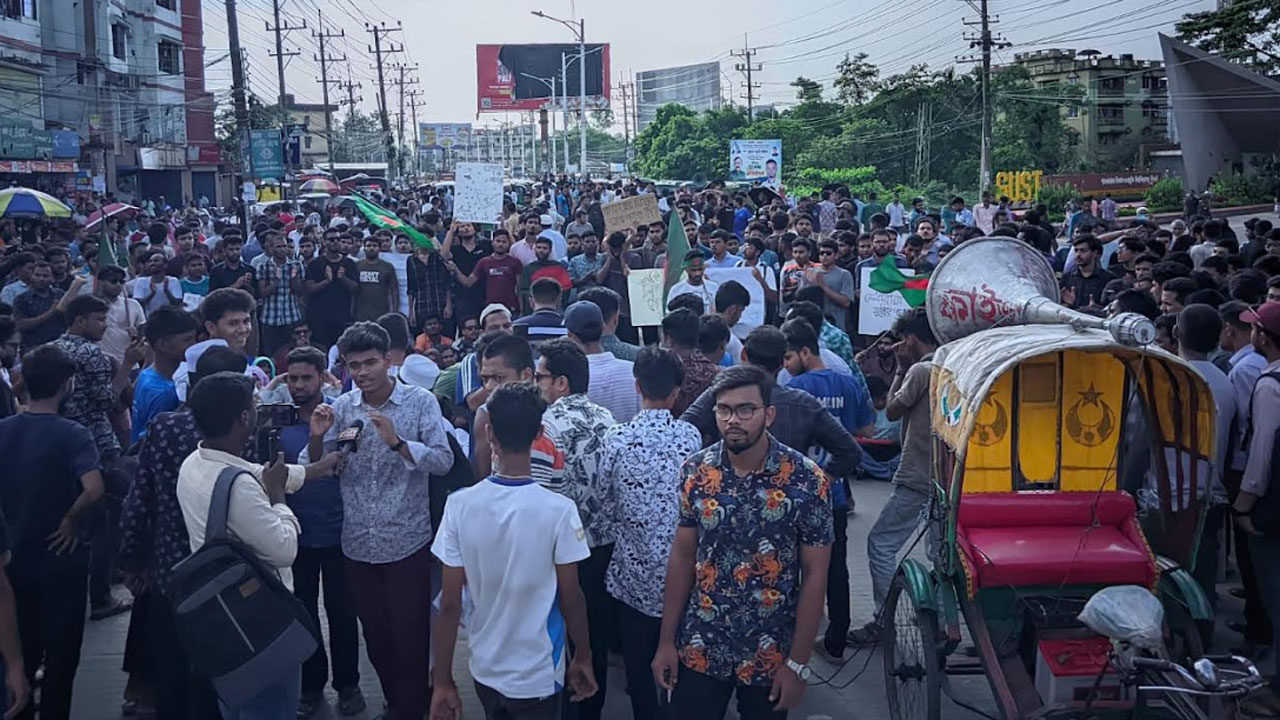 রোববার (৭ জুলাই) বিকেল সাড়ে ৩টায় ক্যাম্পাসে বিক্ষোভ মিছিল বের করেন শিক্ষার্থীরা। মিছিলটি নিয়ে বিশ্ববিদ্যালয়ের প্রধান ফটকের সামনে সিলেট-সুনামগঞ্জ মহাসড়ক অবরোধ করেন তারা। পরে বিকেল ৪টা ১০ মিনিটে সমস্বরে জাতীয় সঙ্গীত গান আন্দোলনকারীরা। এসময় শান্তিপূর্ণ আন্দোলনের ঘোষণা দেন তারা।
