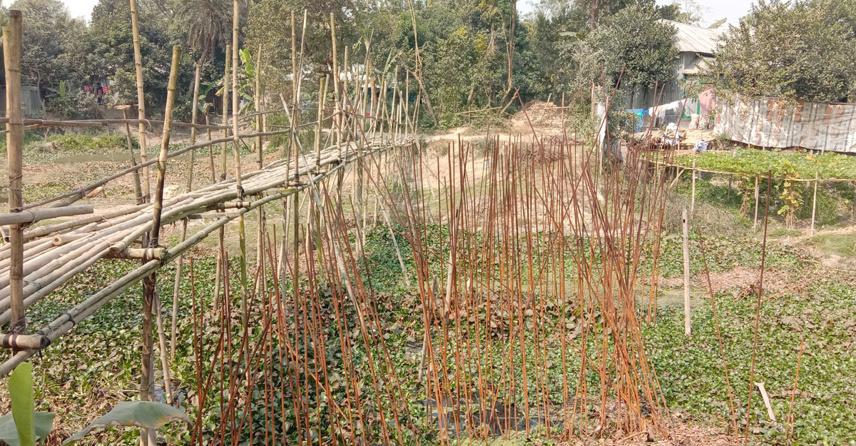 সেতুর নির্মাণ কাজ বন্ধ থাকায় বাঁশের সাঁকো দিয়ে চলছে ঝুঁকিপূর্ণ পারাপার