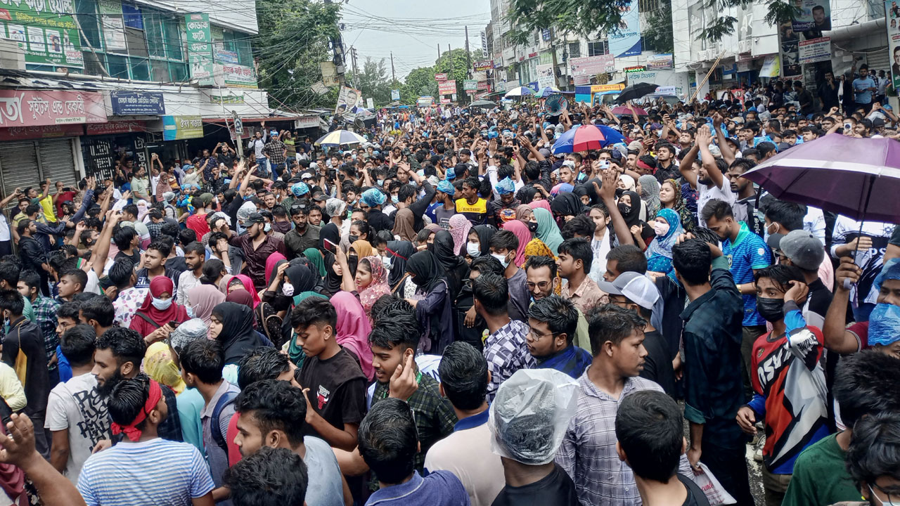 সেখানে ‘ছাত্র-জনতার দফা এক দাবি এক, স্বৈরাচারীর পদত্যাগ’, ‘আমার ভাই জেলে, খুনি কেন বাহিরে’, ‘আমার ভাই মরলো কেন, প্রশাসন জবাব দে’, ‘আপস না সংগ্রাম, সংগ্রাম সংগ্রাম’, ‘আমার ভাইয়ের রক্ত, বৃথা যেতে দেব না’, ‘স্বৈরাচারীর গদিতে, আগুন লাগাও এক সাথে’ ইত্যাদি স্লোগান দেন শিক্ষার্থী।