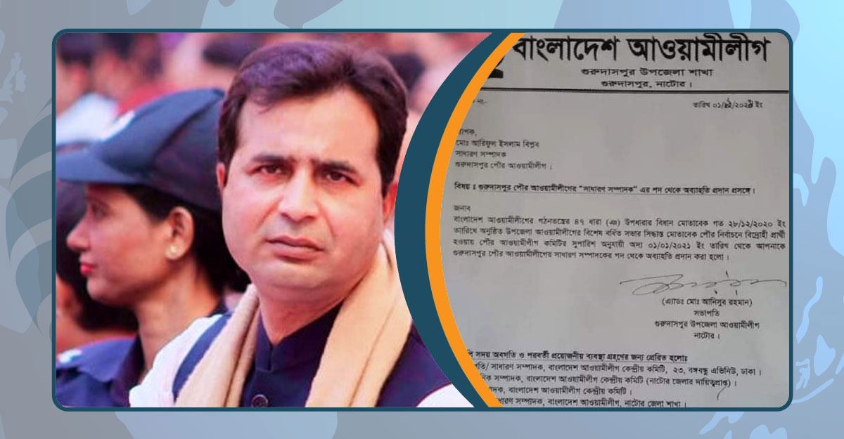 নাটোরের গুরুদাসপুর পৌর আওয়ামী লীগের সাধারণ সম্পাদক মো. আরিফুল ইসলাম বিপ্লবকে দলীয় পদ থেকে বহিষ্কার করা হয়েছে। দলের সিদ্ধান্ত ও শৃঙ্খলা ভঙ্গ করে নৌকার বিদ্রোহী প্রার্থী হওয়ায় তাকে দল থেকে বহিষ্কার করা হয়।