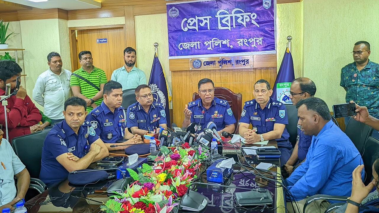 এদিকে রংপুর মেট্রোপলিটন পুলিশের কমিশনার মো. মনিরুজ্জামান বলেন, অনেক কষ্ট, দুঃখ ভরা হৃদয় নিয়ে আপনাদের সামনে হাজির হয়েছি। আমাদের সব অফিসাররা উপস্থিত হয়েছে। আমরা ব্যথিত, আমরা দুঃখিত। রংপুরে অনেক অনাকাঙ্ক্ষিত ঘটনা ঘটেছে। হয়তো আরও ঘটনা ঘটতে পারত কিন্তু আমরা বিএনপি, জামায়াতে ইসলামী, জাতীয় পার্টি ও ইসলামী আন্দোলন বাংলাদেশের নেতৃবৃন্দের সঙ্গে কথা বলেছি এবং তারা আমাদের সহযোগিতা করেছে। তাদের সহযোগিতার কারণে রংপুরে আর কোনো অপ্রীতিকর ঘটনা ঘটেনি।