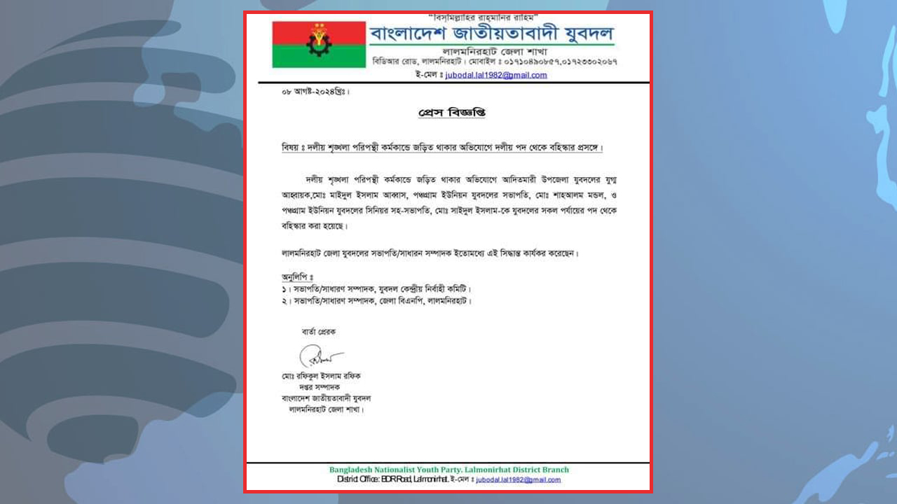 বহিষ্কার পত্রে উল্লেখ করা হয়, দলীয় শৃঙ্খলা পরিপন্থী কর্মকাণ্ডে জড়িত থাকার অভিযোগে আদিতমারী উপজেলা যুবদলের যুগ্ম আহ্বায়ক মো. মাইদুল ইসলাম আব্বাস, সদর উপজেলার পঞ্চগ্রাম ইউনিয়ন যুবদলের সভাপতি মো. শাহআলম মন্ডল ও পঞ্চগ্রাম ইউনিয়ন যুবদলের সিনিয়র সহ-সভাপতি মো. সাইদুল ইসলামকে যুবদলের সকল পর্যায়ের পদ থেকে বহিষ্কার করা হয়েছে।