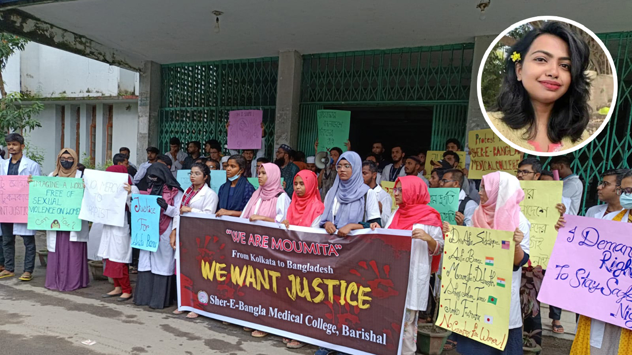 এ সময় শিক্ষার্থীদের প্ল্যাকার্ড হাতে ‘উই ওয়ান্ট জাস্টিস, নো মোর রেপিস্ট’, ‘জাস্টিস ফর মৌমিতা, জাস্টিস ফর মৌমিতা’, ‘তনু থেকে মৌমিতা, বরিশাল থেকে কলকাতা’, ইত্যাদি স্লোগান দিতে দেখা গেছে।