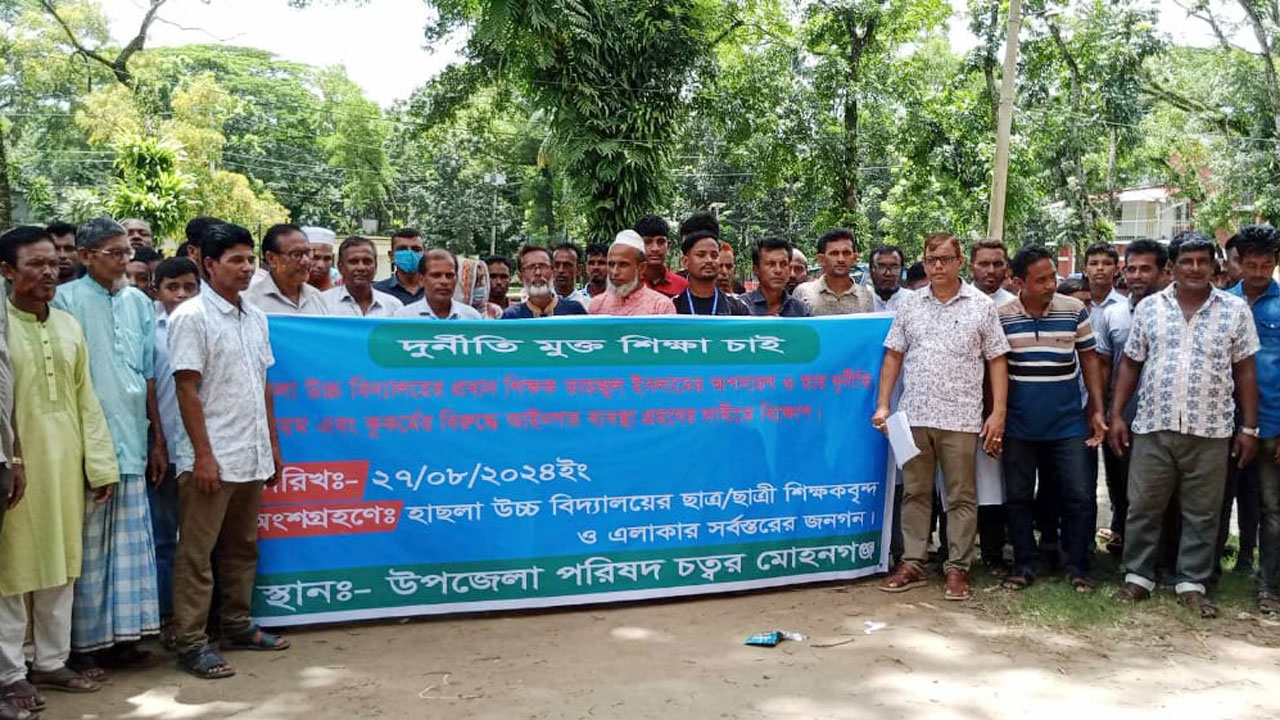 নেত্রকোণার মোহনগঞ্জ উপজেলার হাছলা উচ্চ বিদ্যালয়ের প্রধান শিক্ষক তায়জুল ইসলামের বিরুদ্ধে অনিয়মের অভিযোগ তুলে পদত্যাগের দাবিতে মানববন্ধন করেছেন স্থানীয় লোকজন। মঙ্গলবার দুপুরে উপজেলা চত্বরে ওই শিক্ষকের পদত্যাগের দাবিতে তারা এ মানববন্ধন করেন। এসময় স্কুলের কিছু শিক্ষার্থীও উপস্থিত ছিলো।