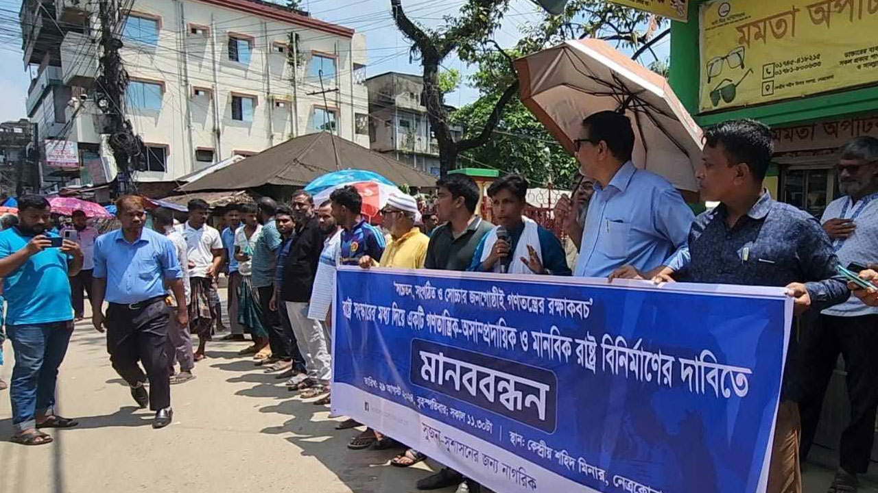 সচেতন, সংগঠিত ও সোচ্চার জনগোষ্ঠীই গণতন্ত্রের রক্ষাকবচ— এই স্লোগানে রাষ্ট্র সংস্কারের মধ্য দিয়ে একটি গণতান্ত্রিক-অসাম্প্রদায়িক ও মানবিক রাষ্ট্র বিনির্মাণের দাবিতে নেত্রকোণায় মানববন্ধন কর্মসূচি পালিত হয়েছে।