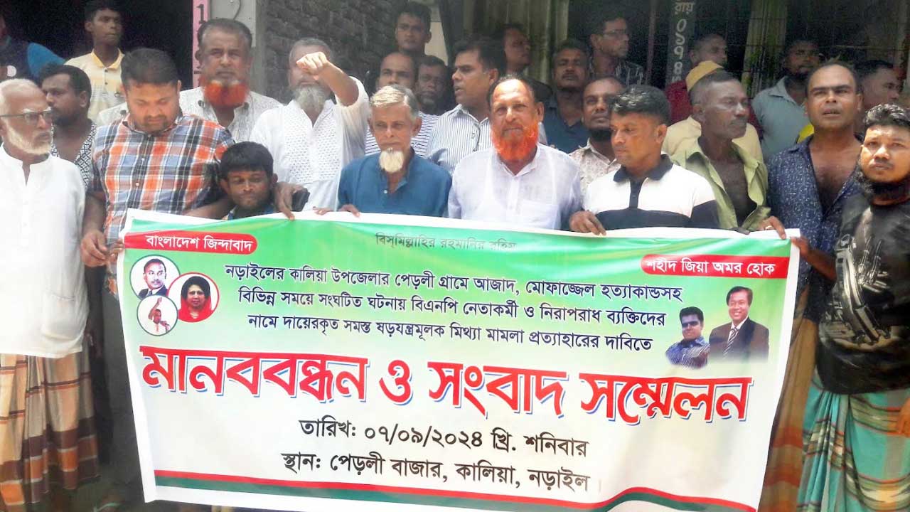 নড়াইলের কালিয়া উপজেলায় বিএনপি নেতাকর্মী ও নিরপরাধ ব্যক্তিদের নামে দায়ের করা ষড়যন্ত্রমূলক মামলা প্রত্যাহারের দাবিতে মানববন্ধন ও সংবাদ সম্মেলন হয়েছে।