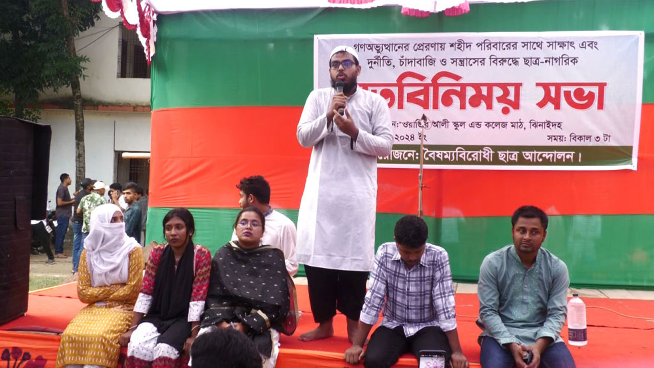 গণঅভ্যুত্থানের প্রেরণায় শহীদ পরিবারের সাথে সাক্ষাৎ এবং দুর্নীতি চাঁদাবাজি ও সন্ত্রাসের বিরুদ্ধে ছাত্র-নাগরিক মতবিনিময় সভা অনুষ্ঠিত হয়েছে। গতকাল বিকেলে ঝিনাইদহ শহরের উজির আলী স্কুল এন্ড কলেজ মাঠে বৈষম্যবিরোধী ছাত্র আন্দোলন এ সভার আয়োজন করে।